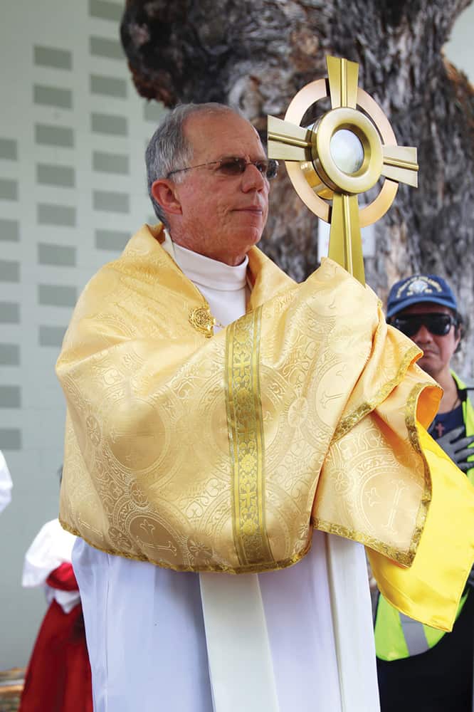 Vicar general Msgr. Gary Secor led the diocese’s annual Corpus Christi street procession from the Co-Cathedral of St. Theresa to the Cathedral Basilica of Our Lady of Peace, June 3, the feast of the Solemnity of the Most Holy Body and Blood of Christ.