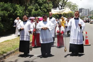 Along the 1.25 mile route over the freeway and into downtown Honolulu, priests and deacons took turns carrying the heavy monstrance, protected from the sun by a four-posted canopy carried by lay persons.