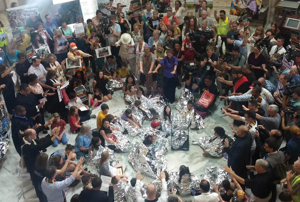 Religious leaders — including priests and women and men religious, the Franciscan Action Network, members of the Sisters of Mercy, the Columbans and others — surrounded a group of children wrapped in aluminum insulation blankets in a building at the Capitol and called for prayer and fasting to bring an end to the misery of separated families on the border. The insulation blanket was like those handed out to children in detention centers at the border.