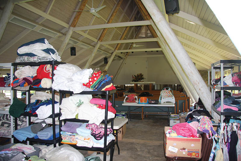 The mission church, awaiting repairs, has become a temporary storage center for clothing and other relief items for Kauai’s flood victims.