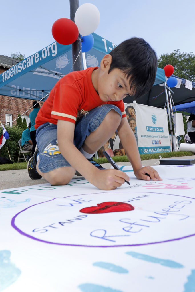 A boy from Afghanistan prints his name on a banner June 20, 2017, during a Catholic Charities-hosted party for refugees on World Refugee Day in Amityville, N.Y. (CNS photo/Gregory A. Shemitz)