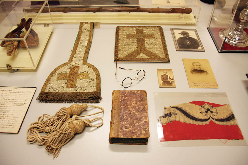 Clockwise from top: The Sacred Hearts archives includes many personal items belonging to St. Damien including his pipe (at top left), glasses, and part of a red handkerchief he used as an arm sling at the end of his life. (HCH photos|Anna Weaver)