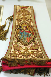 One of Ching’s favorite pieces in the collection is the large handkerchief that Mother Marianne gave Father Damien to use as an arm sling at the end of his life. (It’s seen in some of the famous photos of Damien in his last days). The handkerchief was later given back to Mother Marianne after Father Damien’s death. She cut it up and gave pieces of it out as “mementos of the saintly priest.”