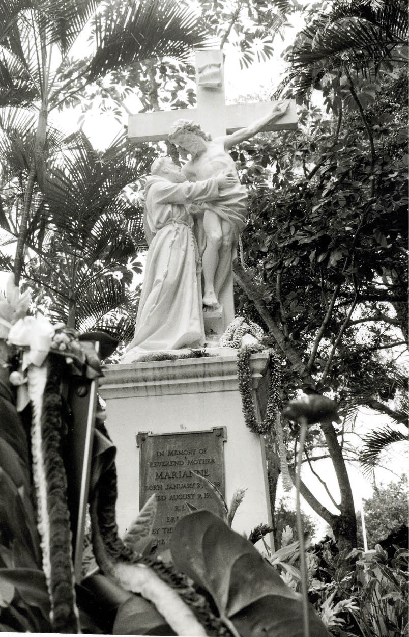 St. Marianne was the only Franciscan Sister to be buried in Kalaupapa. Her gravesite sits in the shade of several large trees. Soon after her death, Kalaupapa residents erected a monument for her, a nearly life-size sculpture of the crucified Christ reaching down to embrace St. Francis of Assisi.