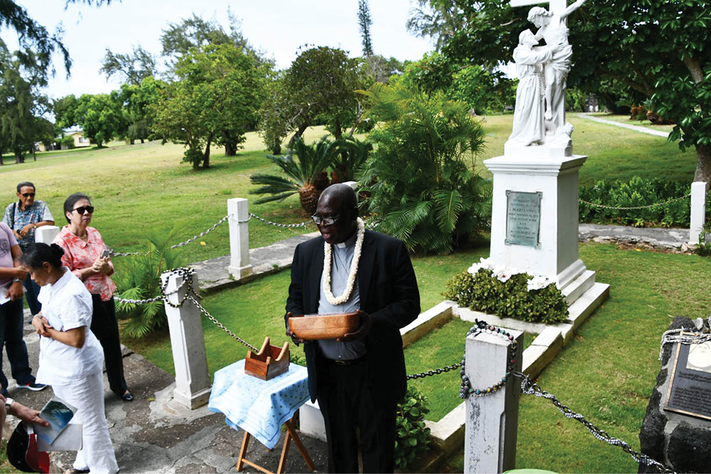 Archbishop Matthew Man-Oso Ndagoso of the Archdiocese of Kaduna, Nigeria, holds a relic of St. Marianne Cope in front of her gravesite in Kalaupapa, Molokai, July 14. (Photo courtesy of Darlene Namahoe)