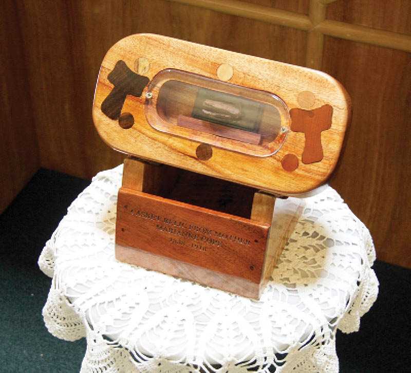 St. Marianne’s coffin fragment relic was held in a reliquary made of native Hawaiian woods by craftsman Manny Mattos, a parishioner of Resurrection of the Lord Parish in Waipio, Oahu.