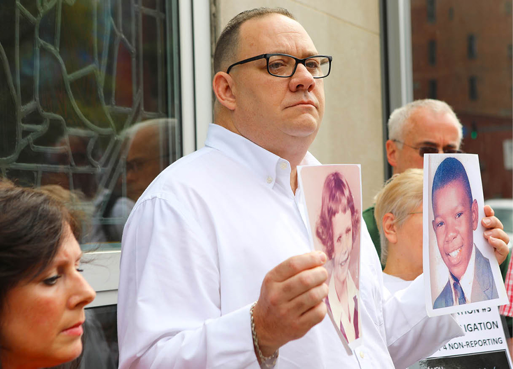 Jim VanSickle of Pittsburgh holds photos of abuse victims as members of the Survivors Network of those Abused by Priests (SNAP) hold a news conference in front of the Diocese of Pittsburgh Aug. 20, 2018, several days after a Pennsylvania grand jury released a stinging report that said more than 300 priests sexually abused more than 1,000 children during the course of several decades. VanSickle told the grand jury that he was sexually abused by a priest as a teenager in Bradford, Pennsylvania. (CNS photo/Chaz Muth)