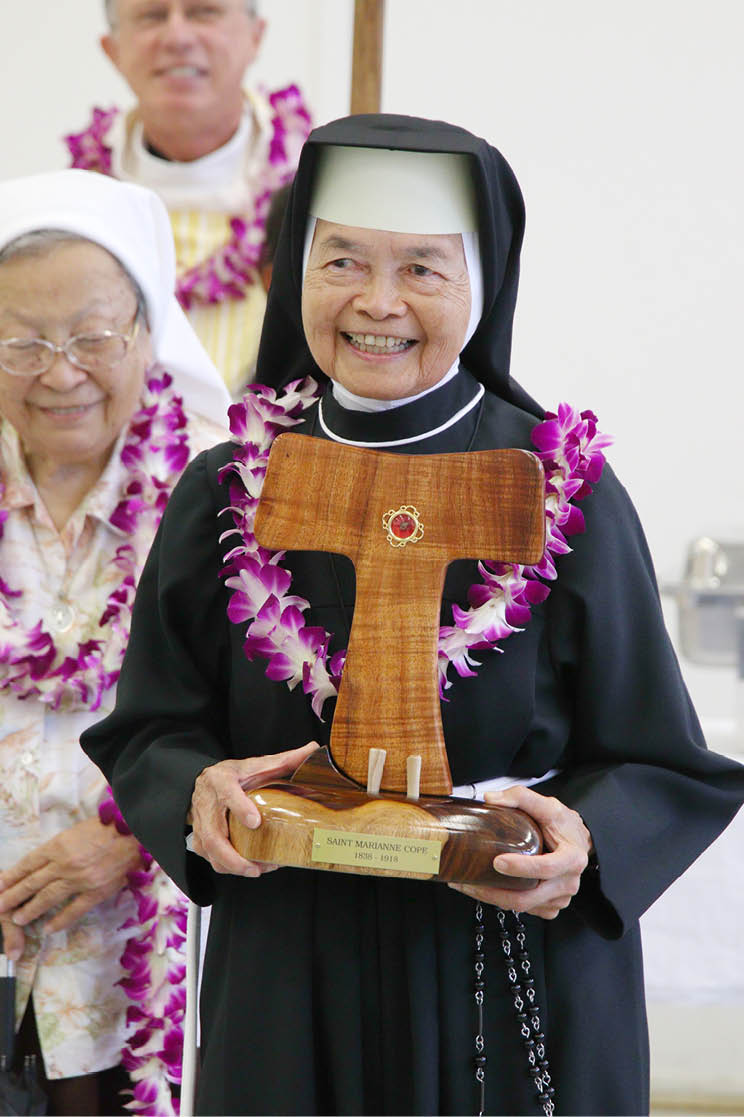 Sister of St. Francis of the Neumann Communities Charlene Epil carries a relic of St. Marianne Cope at a Mass commemorating the centenary of the death of the Molokai saint, Aug. 9, in the Almeida Center of Saint Francis School in Honolulu. Bishop Larry Silva was the main celebrant. (HCH photo | Dann Ebina)
