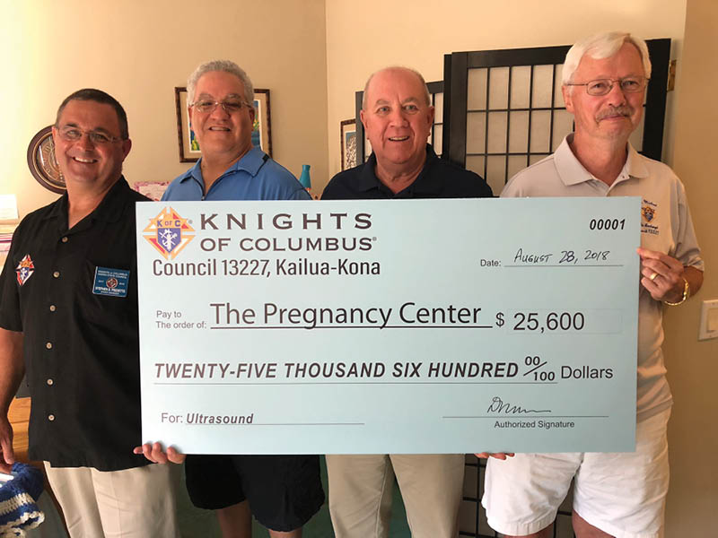 The Knights of Columbus Council #13227 in Kona, with support from Supreme Headquarters, a private trust fund and local donors, on Aug. 28 donated $25,600 for the purchase of a second ultrasound machine for the Pregnancy Center in Kailua-Kona. The machine will enable the medical team at the center to peer into the miracle of the womb with extraordinary clarity. “With these moving images of the pre-born, the bond between mother, father and baby is expressed and the value of life is visually realized,” said the Knights in their announcement. This is the second such donation by the Kona Knights. In 2013 they donated $25,000 for the pregnancy center’s first portable ultrasound machine. The Pregnancy Center, which has served the Kailua-Kona community for 26 years, says it is incredibly thankful to Council #13227 for standing beside its mission to be a light of hope and healing on the Big Island. (Photo courtesy of Joe James, St. Michael the Archangel Council 13227)