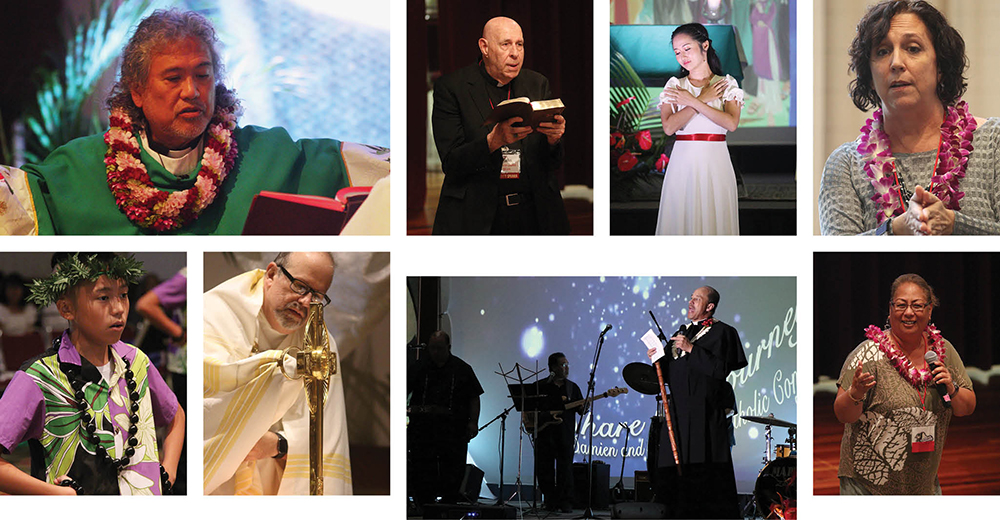 Clockwise from top left: Father Alapaki Kim presides at the Damien and Marianne Catholic Conference’s Hawaiian-language closing Mass Oct. 7. Bishop Larry Silva gives a keynote presentation Oct. 5. Liturgical movement during the Vietnamese language Mass on Oct. 6. Eva Andrade, Hawaii Family Forum president and CEO, spoke on physician-assisted suicide. Debbie Victor of the Pua Foundation spoke about community reintegration after incarceration Oct. 5. The Archdiocese of New Orleans’ Father Tony Ricard emcees a Friday night concert of local bands. Deacon Modesto Cordero, a conference organizer, leads Eucharistic adoration on Oct. 5. Fred Duhaylonsod helps lead a Hawaiian sacred chant at the Hawaiian language Mass. (All photos by Dann Ebina except Father Ricard photo by Anna Weaver.)