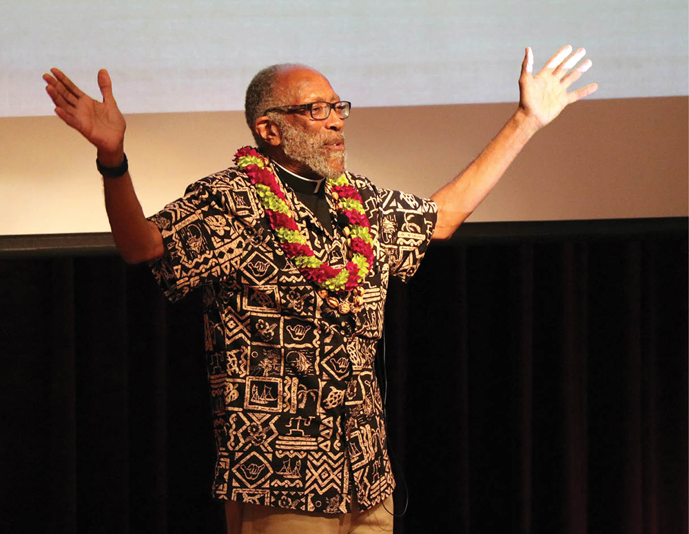 Sporting an aloha shirt, bare feet and a big smile, Msgr. Raymond East strode around the front of the Hawaii Convention Center auditorium on Oct. 5, leading an interactive discussion on “Encounter, Discernment and Accompaniment.”