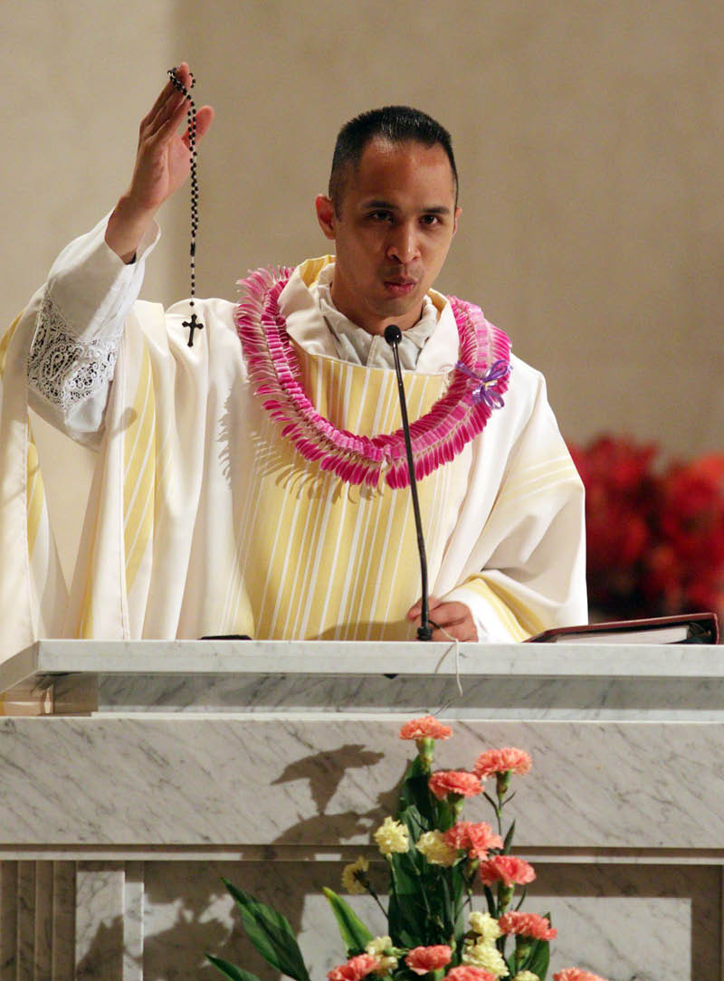 Father Joseph Aytona, mission director of the Congregation of the Fathers of Mercy in Kentucky, preaches during a Divine Mercy Crusade at the Co-Cathedral of St. Theresa Oct. 10. He and Father Mark Wheelan, a Missionary of Mercy from the Society of Our Lady of the Most Holy Trinity in Texas, led the series of parish missions at six parishes on four islands, Oct. 3-10. Each mission included a holy hour, a talk and Mass followed by veneration of a first-class relic of St. Faustina Kowalska. (HCH photo | Dann Ebina)
