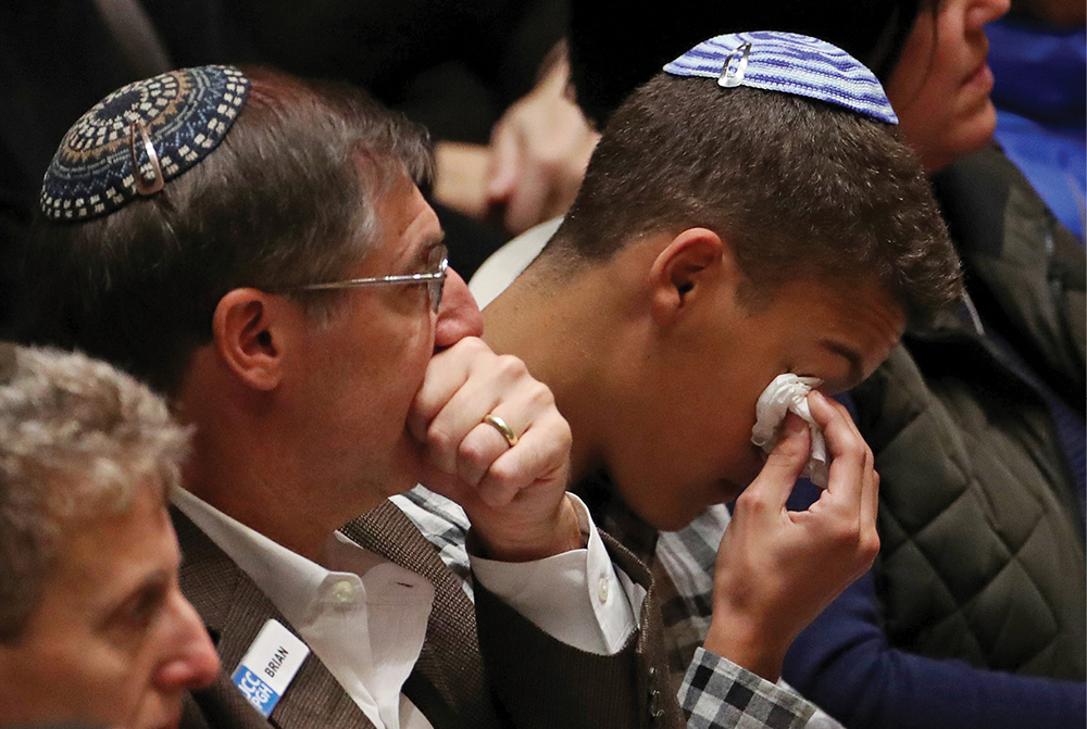 People mourn during a memorial service at the Sailors and Soldiers Memorial Hall of the University of Pittsburgh Oct. 28, a day after a deadly shooting the Tree of Life Synagogue in Pittsburgh. At least 11 people were killed and six others wounded, including four police officers, during the Oct. 27 shooting at the synagogue. (CNS photo/Jeffrey Becker, USA TODAY Sports via Reuters)
