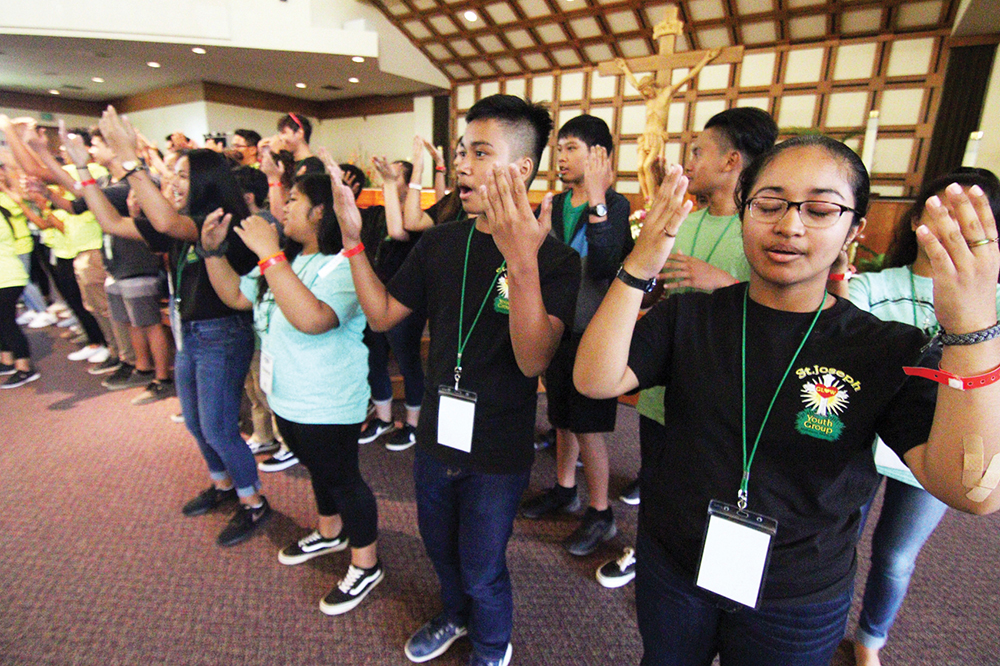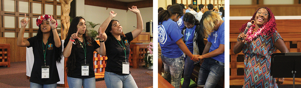 Four hundred and sixty young Catholics from throughout the Hawaiian islands registered for this year’s Diocesan Youth Day held at St. Ann Church in Kaneohe on Oct. 27. An additional 65 people were involved as planners, speakers and volunteers. This year’s keynote speakers were Anaheim Life Teen movement member and Catholic speaker Chika Anyanwu (pictured at bottom right) and Catholic hip hop artist Joe Melendrez. Diocesan Youth Day is organized by the Office of Youth and Young Adult Ministry and funded in part by the Hawaii Catholic Community Foundation. (Photos courtesy of Dann Ebina)