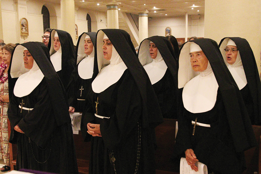 Women wearing the Franciscan habits of a century ago reenact the arrival of Mother Marianne Cope and six companion Franciscan Sisters before a Mass commemorating the 135th anniversary of that event in the Cathedral Basilica of Our Lady of Peace. Mother Marianne was the superior of her order in Syracuse, New York, in 1883 when she answered a request from the Hawaiian government for religious nursing sisters to care for leprosy patients. She and six sisters arrived in Hawaii on Nov. 8, 1883. The other sisters were Sister M. Bonaventure Caraher, Sister Crescentia Eilers, Sister Ludovica Gibbons, Sister Renata Nash, Sister M. Rosalia McLaughlin and Sister Mary Antonella Murphy. Their first stop was at the Honolulu cathedral. Mother Marianne served the rest of her life in Hawaii, dying in Kalaupapa in 1918. The Franciscan Sisters have since prospered in the islands in the areas of health care and education. Pope Benedict XVI canonized St. Marianne in St. Peter’s Square at the Vatican on Oct. 21, 2012. Bishop Larry Silva celebrated the anniversary Mass. (HCH photo | Dann Ebina)
