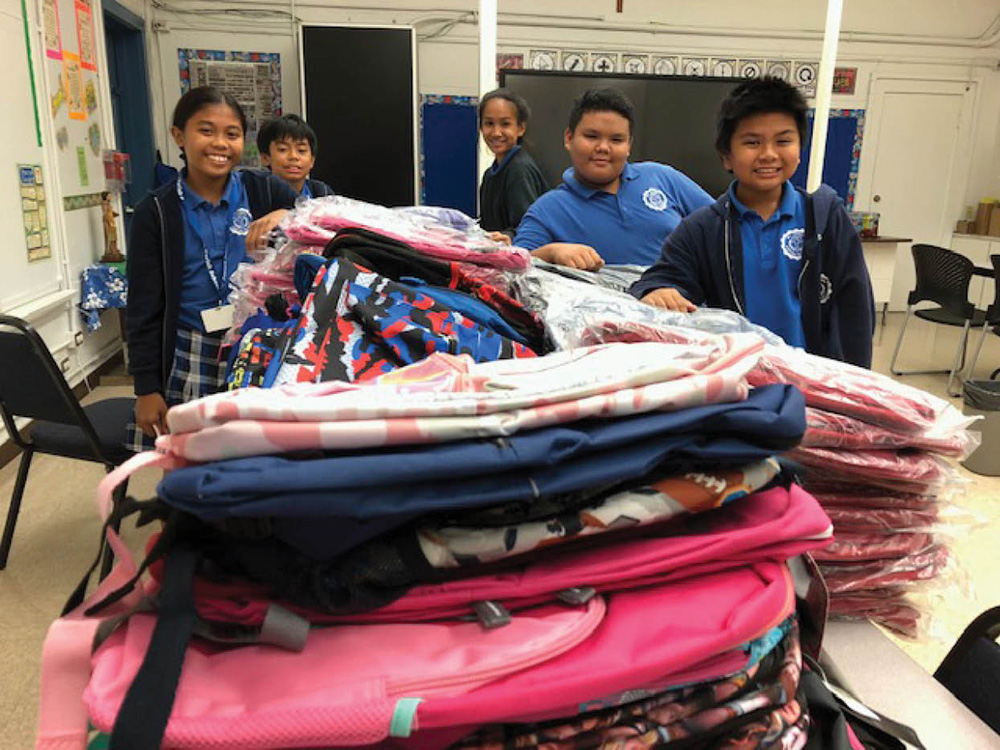 Members of the student council of St. Joseph School in Waipahu pose with some of the more than 200 backpacks and assorted school supplies students and parents collected for children of the school’s sister parish, Immaculate Heart of Mary in Naguelguel, Lingayen, Pangasinan, Philippines. The parish serves fishing villages in that region that have recently been overcome by typhoons. The St. Joseph children sent seven balikbayan boxes. A balikbayan box is a large corrugated cardboard box containing goods sent home by overseas Filipinos. It is hoped that they will receive them by Christmas. (Photo courtesy of Beverly Sandobal)