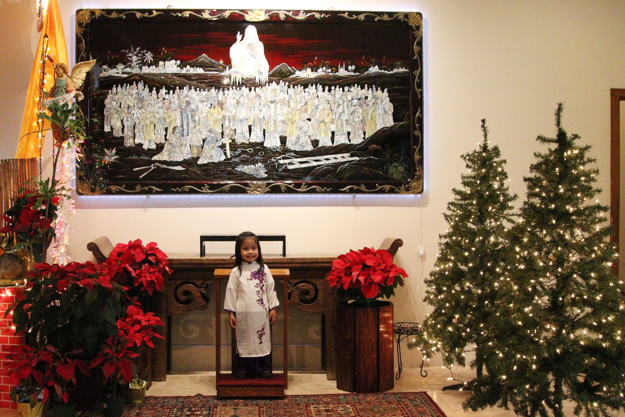 A little girl stands in front of a portrait of the 117 Vietnamese martyrs prior to the deacon ordination of Vincent Ahn Vu on Dec. 18 at the Co-Cathedral of St. Theresa in Honolulu. HCH Photo|Dann Ebina