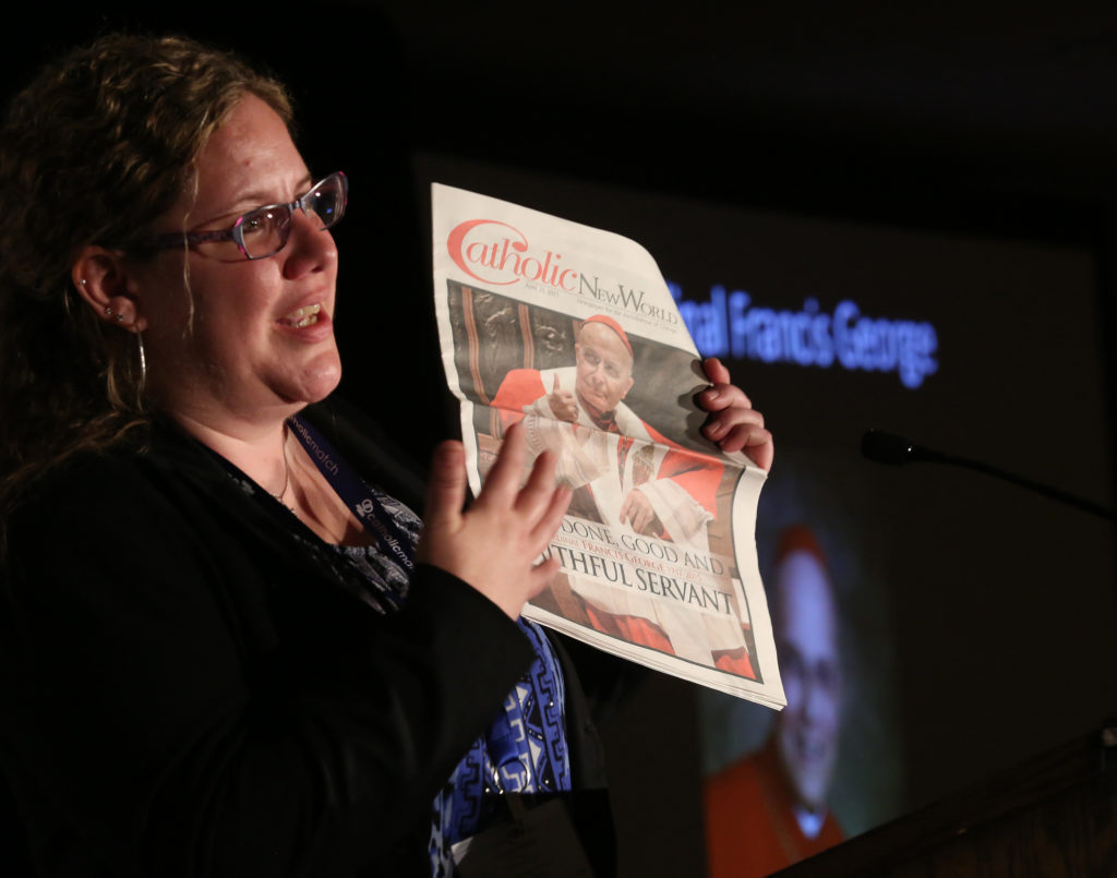 Joyce Duriga, editor of the Catholic New World in Chicago, speaks after accepting the annual Bishop John England Award June 24 on behalf of the late Cardinal Francis E. George of Chicago. The cardinal, who died earlier this year, was recognized “for distinguished service in exercising and defending the First Amendment rights of Catholic newspapers,” during the 2015 Catholic Media Conference in Buffalo, N.Y. (CNS photo/Bob Roller)