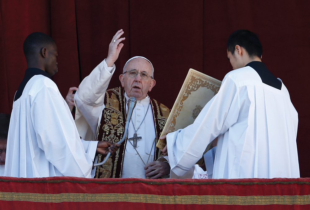 Pope Francis delivers his Christmas blessing “urbi et orbi” (to the city and the world) from the central balcony of St. Peter’s Basilica at the Vatican Dec. 25. (CNS photo/Paul Haring)