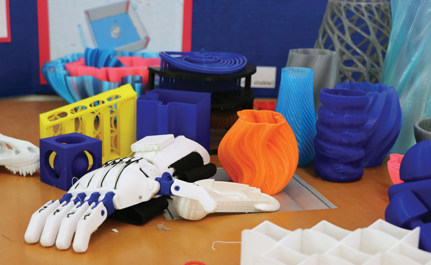 An early hand prototype sits beside other FabLab student projects. (HCH photo | Anna Weaver)