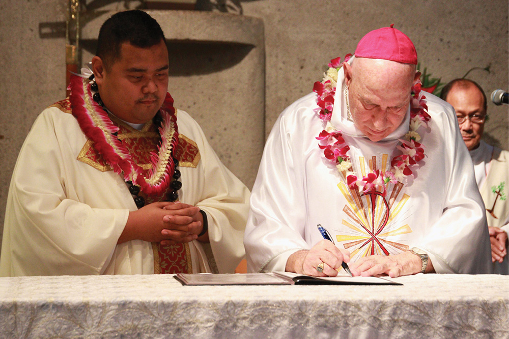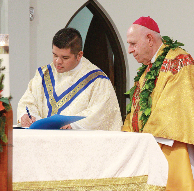 Bishop Larry Silva installed two new Oahu pastors in mid-January, both among the newest and youngest of the Diocese of Honolulu’s priests. Pictured above, Father Alfred Guerrero is the new pastor of the Newman Center/Holy Spirit Parish at the University of Hawaii-Manoa, following the retirement of outgoing pastor, Father Jack Ryan. Father Guerrero’s installation Mass was on Jan. 13. At right, Bishop Silva installed Father EJ Resinto as the pastor of Sacred Heart Parish in Punahou on Jan. 12. Sacred Heart and St. Pius X Parish unlinked themselves as of Jan. 1. The two parishes were previously clustered under one pastor and known as the Manoa-Punahou Catholic Community. Father Resinto had been one of community’s parochial vicars prior to the split. The other former parochial vicar, Father Thomas Joseph, is now St. Pius X’s administrator. Manoa-Punahou’s previous pastor, Father Gordian Carvalho, recently retired. (HCH photos | Dann Ebina)