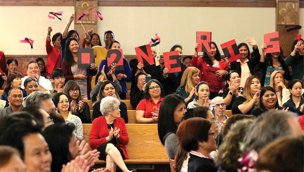 Supporters cheer for 20-year service honoree Nerissa Ramos from St. Philomena Early Learning Center in Salt Lake as she is recognized at the end of the ACCE Mass. (HCH photo | Anna Weaver)