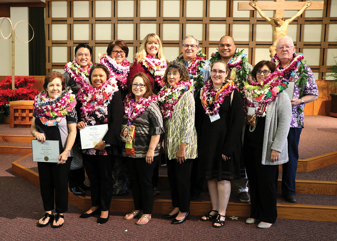 Educators who have served 20, 30 and 40 years in Hawaii Catholic schools were recognized at the ACCE. In the top row from left are Jeff Chang, Antoinette Nishida, Heidi McGivern, Gaston Gosselin, Brent Limos and Irish Christian Brother Liam Nolan. In the bottom row from left are Lynda Paishon, Michele Guarino, Carla Castro, Charlene Martin, Jill Sprott and Shana Tong. Not pictured are Nerissa Ramos, Mardi Laprade, James Morris and Elaine Cubi. (HCH photo | Anna Weaver)
