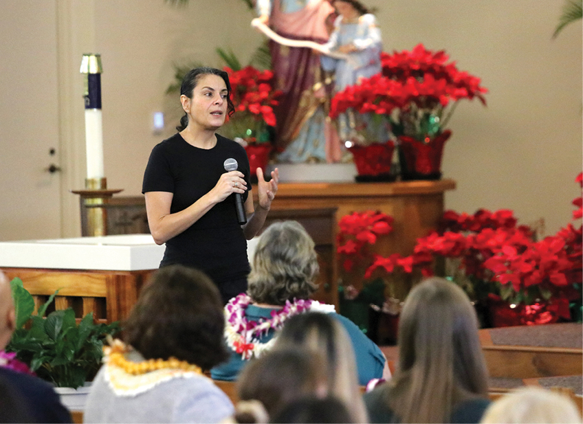 After Mass and refreshments, Jodee Blanco, a national anti-bullying expert and advocate, led the educators in her three-part training entitled “It’s Not Just Joking Around!” about how to recognize and stop school bullying. Blanco was also scheduled to present at St. Catherine School on Kauai, St. Ann School in Kaneohe, Our Lady of Good Counsel School in Pearl City, St. John the Baptist School in Kalihi, Holy Family Catholic Academy in Honolulu, and Sacred Hearts School on Maui. Blanco’s talks were supported by the Hawaii Catholic Schools office and a grant from the Augustine Educational Foundation. (HCH photo | Anna Weaver)