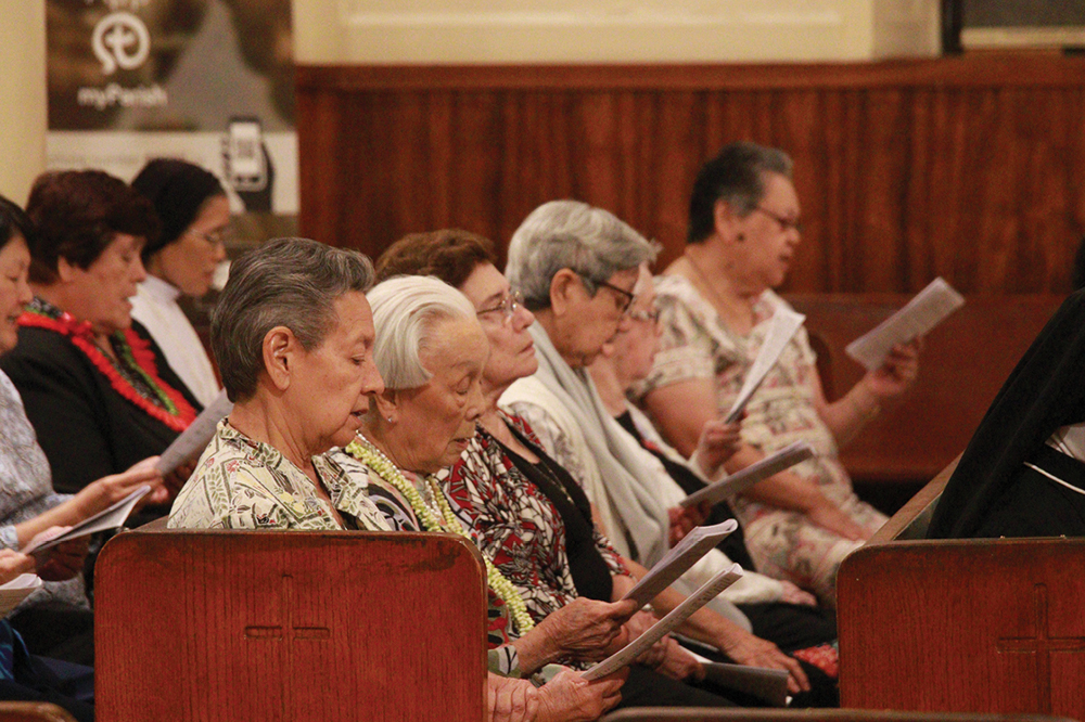 Sisters of St. Francis of the Neumann Communities, and friends of the sisters, sing during the Jan. 23 Mass celebrating the feast day and birthday of St. Marianne Cope, their founder in Hawaii, in the Cathedral Basilica of Our Lady of Peace. Bishop Larry Silva presided. (HCH photo | Dann Ebina)