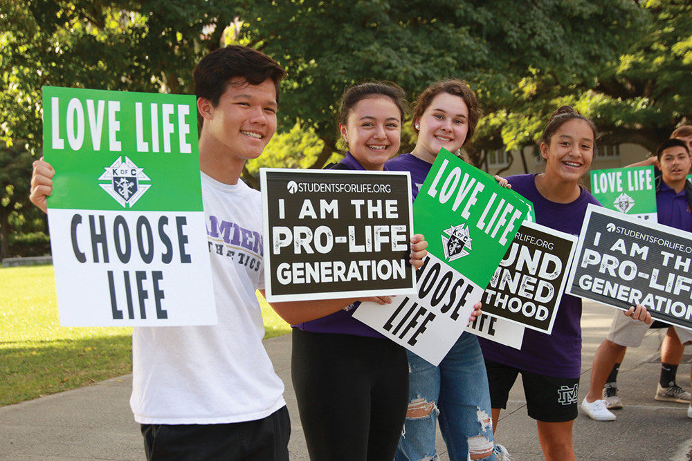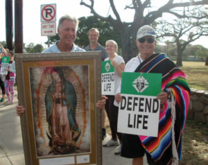 Students from Damien Memorial School hold signs opposing abortion at Oahu’s annual March for Life Jan. 22 at the Hawaii State Capitol. Far right, a pro-life advocate holds a picture of Our Lady of Guadalupe during the 7th Annual Maui March for Life in Kahului on Jan.26. (Maui photo courtesy of Norman Franco)
