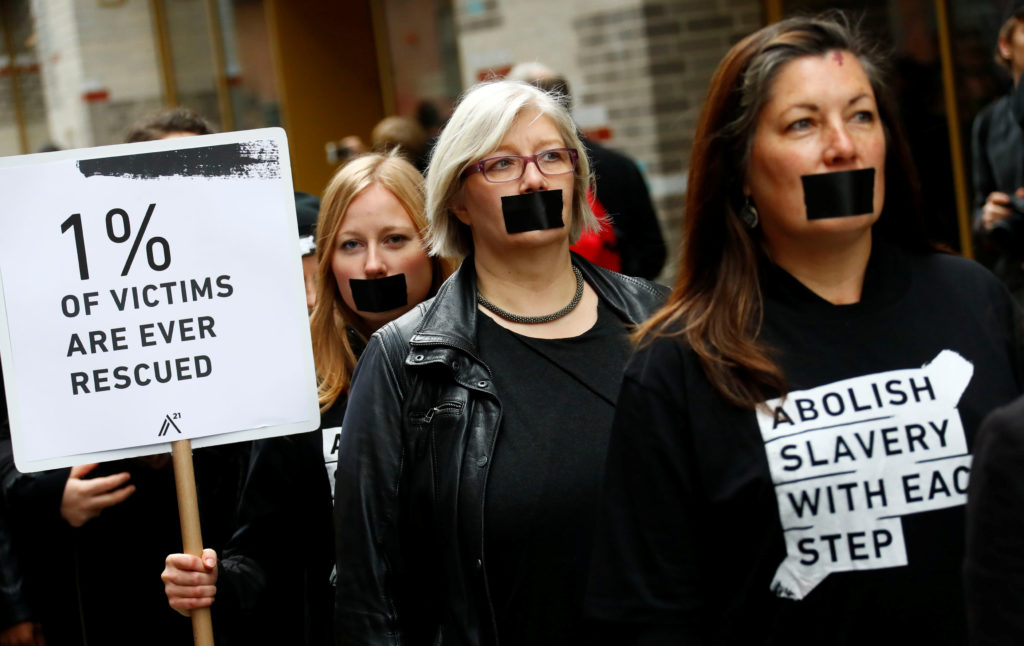 Activists take part in a “Walk for Freedom” in 2018 to protest against human trafficking in Berlin. The Frederick Douglass Trafficking Victims Prevention and Protection Reauthorization Act of 2018 recently passed by Congress and signed Jan. 8 by President Donald Trump allocates $430 million through 2022 to prevent and respond to human trafficking in the U.S. and abroad. (CNS photo/Fabrizio Bensch, Reuters)