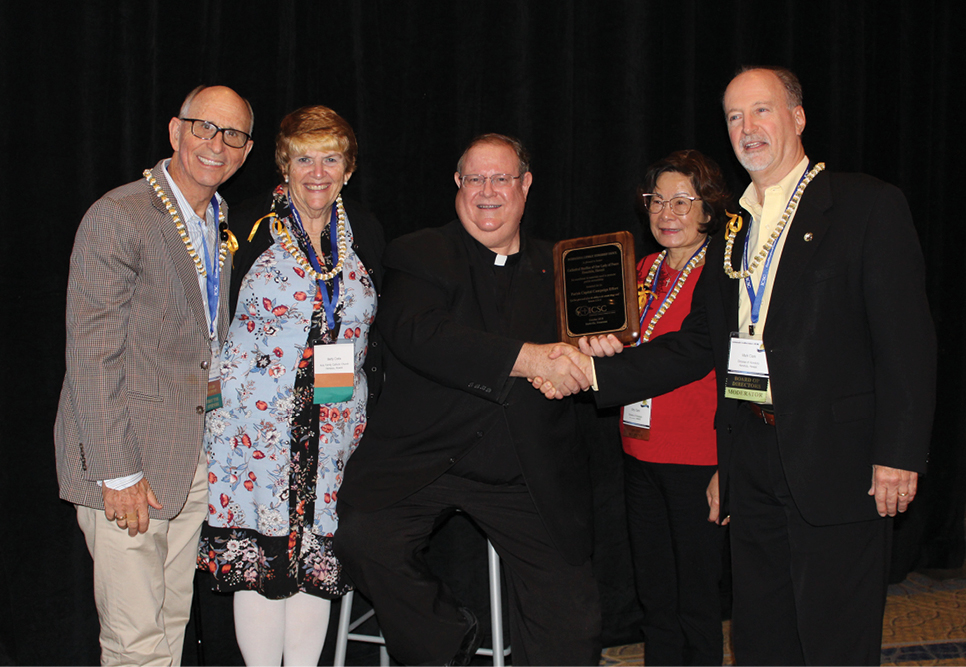 Father Andrew Kemberling, chairman of the board for the International Catholic Stewardship Council presents Mark Clark, director of development and stewardship for the Diocese of Honolulu, with the cathedral campaign’s award for excellence at the International Catholic Stewardship Council conference in Nashville, Oct. 28-31. The others in the photo are, from left, Ed Coda and Betty Coda, members of the cathedral renewal campaign core committee, and Omi Clark. Photo courtesy of Cathedral Basilica of Our Lady of Peace)