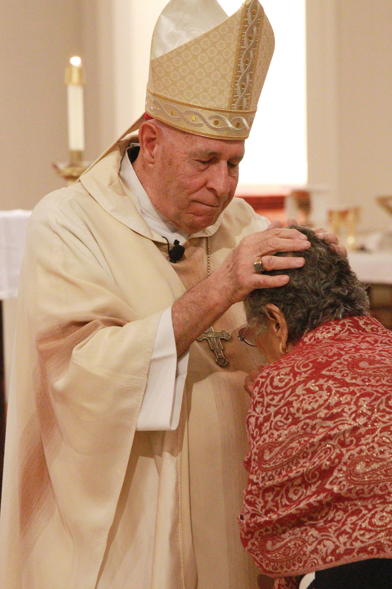 Bishop Larry Silva prays over a parishioner during an evening Mass in the Cathedral Basilica of Our Lady of Peace, downtown Honolulu on Feb. 11 for the World Day of Prayer for the Sick. During the Mass, the Sacrament of the Anointing of the Sick was conferred on those with serious physical and mental illnesses. (HCH photo | Dann Ebina)