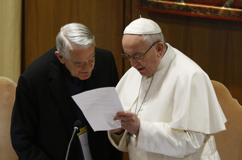 Pope Francis talks with Father Federico Lombardi at the start of the third day of the meeting on the protection of minors in the church at the Vatican Feb. 23, 2019. (CNS photo/Paul Haring)