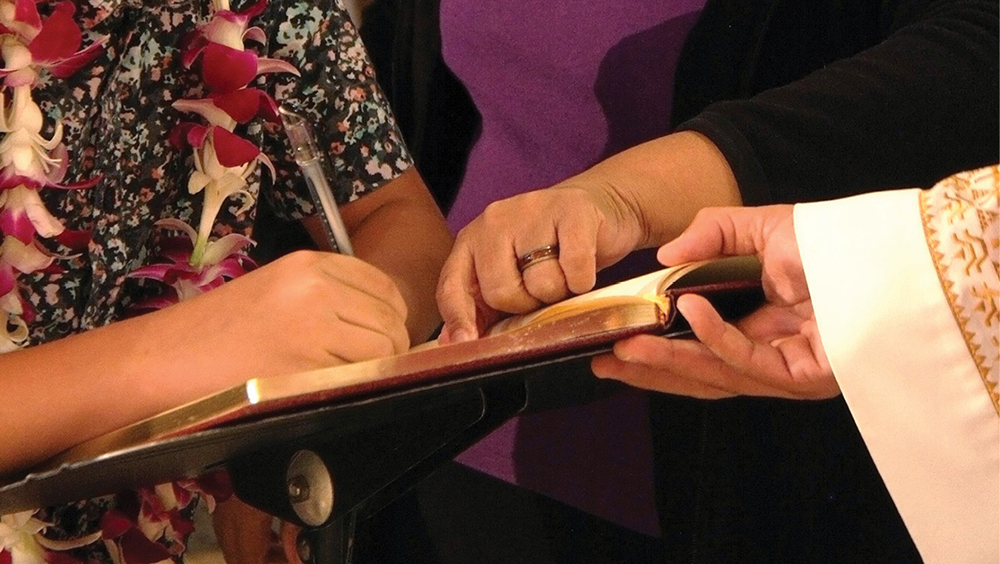 A catechumen signs his name in the Book of the Elect at last year’s Rite of Election on Oahu. (HCH file photo)
