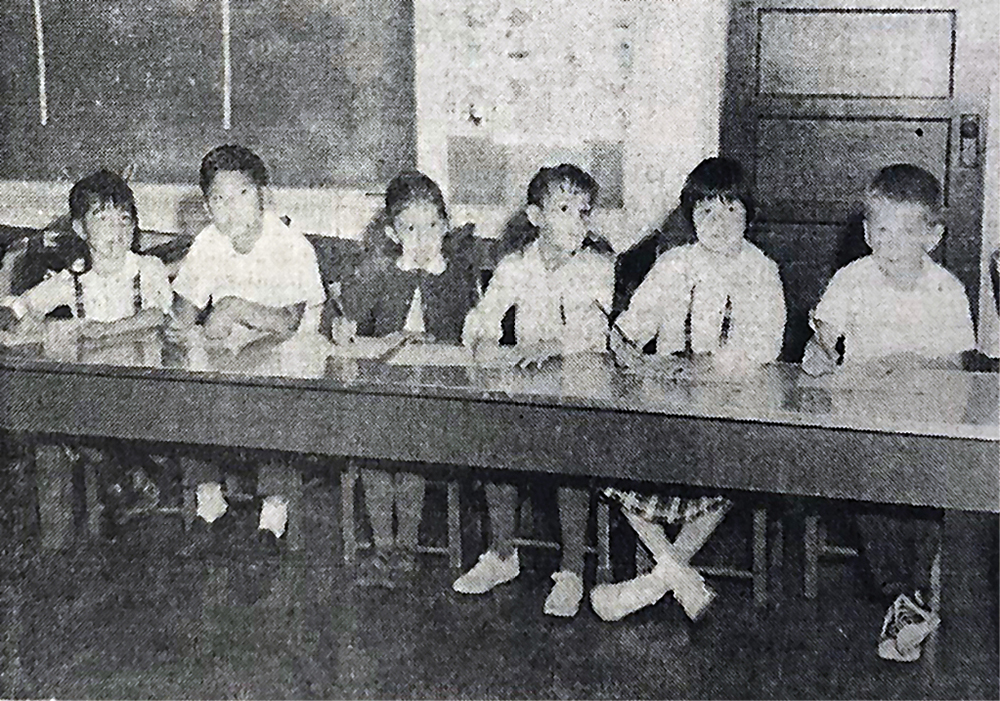 These students (pictured left) are among the leaders of Holy Cross first graders who write to G.I.s in Vietnam. They are (left to right) Cheryl Carveiro, Keven Dela Cruz, Cynthia Michael, Carolyn Carveiro, Lisa Huntsinger, and Richard Carveiro. The first grade class of Holy Cross School in Kalaheo, Kauai, was presented with a plaque from General [George H.] Young stationed in Viet Nam. How did this exciting event come to pass? All the girls and boys in the first grade had been writing little letters and drawing pictures to cheer up the soldiers in Viet Nam. One day a news reporter saw them and put the pictures on T.V. all over Viet Nam and two of the children, Carolyn Carveiro and Kevin Dela Cruz, had their pictures printed in the “Stars and Stripes,” a newspaper for servicemen. Because of the love and gratitude shown in the children’s letters, a plaque was presented by General Young to Sgt. Jackie W. Johnson of the 588th Maintenance Co. to deliver to the children on his special leave during December. The children were pleased and delighted to receive this beautiful plaque from General Young, which came as a total surprise.