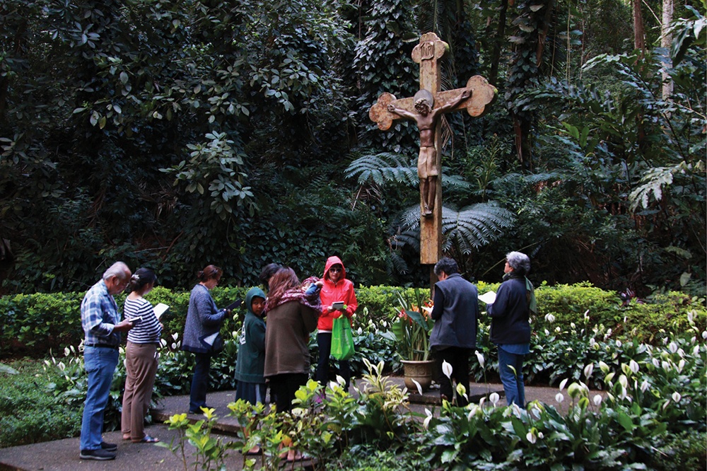 Photo: Prayers in the valley 03/20/2019 by Hawaii Catholic Herald A small group gathers at the final station of the outdoor Way of the Cross at St. Anthony Retreat Center, Kalihi, March 8. (Photo courtesy of Dann Ebina)