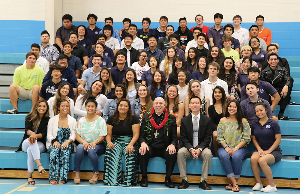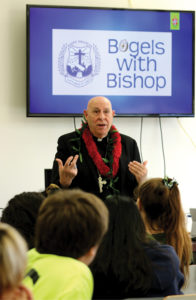The annual event, now organized by the Office of Youth and Young Adult Ministry, brings Bishop Silva together with the senior class at every Catholic high school in Hawaii for bagels (and other breakfast food), a short talk by the bishop, a question-and-answer session, and individual photos with him.