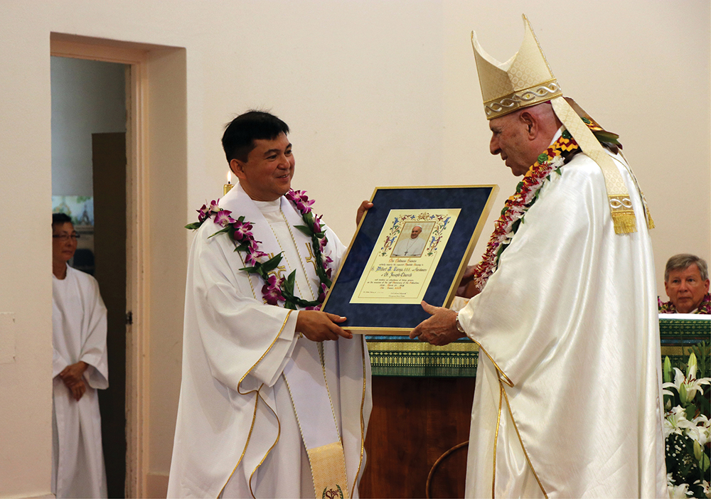 Bishop Larry Silva presents St. Joseph’s pastor, Blessed Sacrament Father Wilbert Laroga, with an apostolic blessing from Pope Francis during the March 24 Mass to celebrate the Hilo church’s dedication 100 years ago. More photos. HCH Photo: Anna Weaver