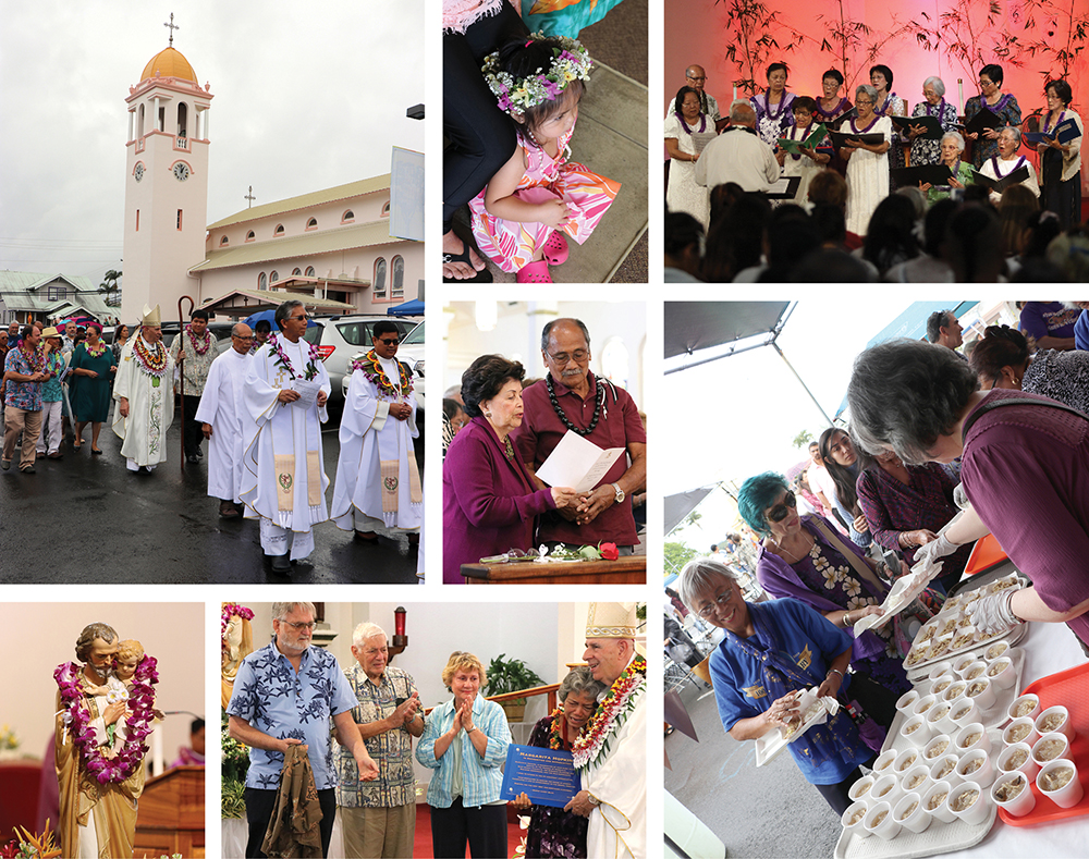 Clockwise from top left: After the March 24 centennial Mass at St. Joseph, Hilo, priests, parishioners and Bishop Larry Silva follow a procession behind the parish’s statue of St. Joseph from the church to the reception tents outside. A young Massgoer in festive attire during the March 24 Mass. A March 22 choir concert included all the parish choirs and several soloists. Pictured here is St. Joseph’s Aloha Choir, which usually sings at parish funerals. (Photo courtesy: Fred Basilio). Serving up international cuisines at the post-Mass centennial reception on March 24. St. Joseph parishioner Margarita Hopkins (second from right), a longtime Diocesan Planning and Building Commission member who recently retired, receives a special recognition from Bishop Silva. The parish’s statue of St. Joseph. Center: Vivian and Dominador Coloma were among those married couples renewing their wedding vows at Mass on March 23. (HCH photos | Anna Weaver)