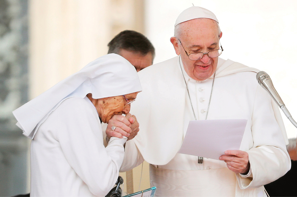 Sister Maria Concetta Esu, an 85-year-old Daughter of St. Joseph, kisses the hand of Pope Francis after the pontiff awarded her the Pro Ecclesia et Pontifice Cross during his general audience in St. Peter’s Square March 27, 2019. (CNS photo/Vatican Media via Reuters)