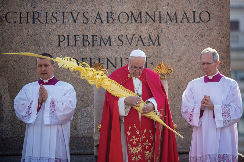 Pope Francis holds palm fronds as he celebrates Palm Sunday Mass in St. Peter’s Square at the Vatican April 14, 2019. (CNS photo/Stefano Dal Pozzolo, pool).)