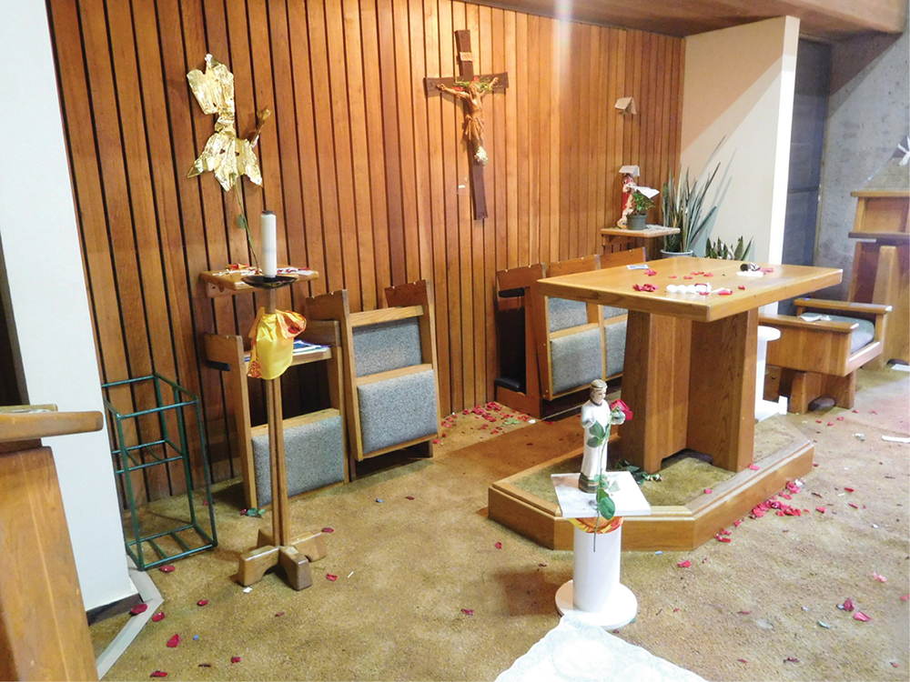 Petals and paper are seen strewn about the sanctuary of St. Damien Chapel, the eucharistic chapel for St. Anthony Parish in Wailuku, Maui, the day after Easter, April 22. Two statues and other objects were damaged in the vandalism. (Photo courtesy of Father Roland Bunda, SM)