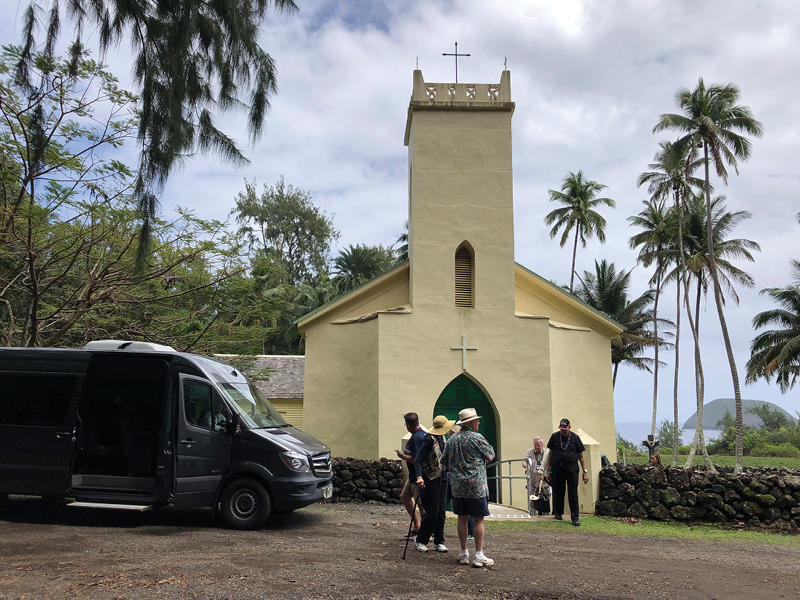 The group then boarded “the nicest vehicle in Kalaupapa and maybe the whole island,” according to tour guide John McBride, a large Mercedes-Benz passenger van purchased with the start of the new Saints Damien and Marianne Cope Molokai Tours.