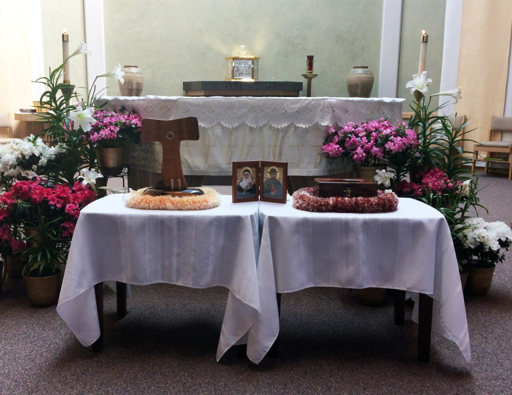 The relics of St. Marianne, left, and St. Damien are displayed in Holy Family Church in Kirkland. (Photo courtesy of Sister Cheryl Wint, OSF)