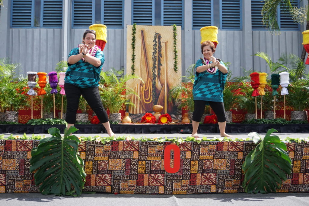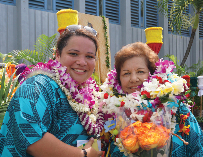 Lynda Paishon, right, with her daughter Nicole Paishon, assistant principal of Holy Family Catholic Academy, with whom she danced the hula at the school’s May Day program on May 3.