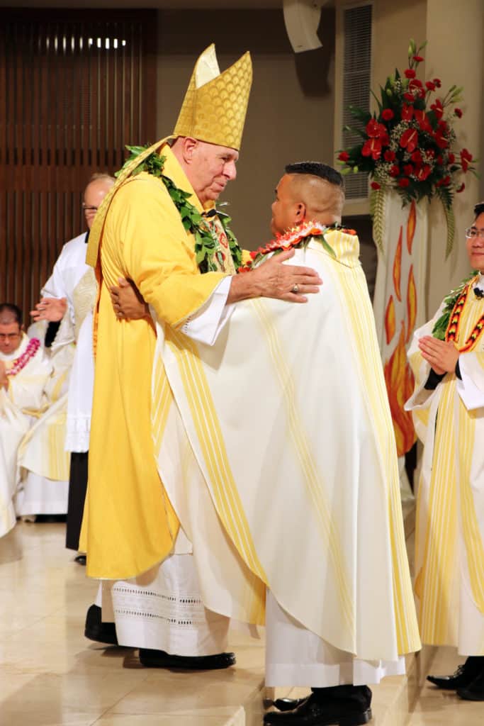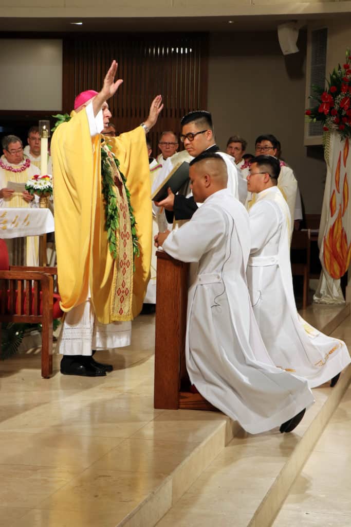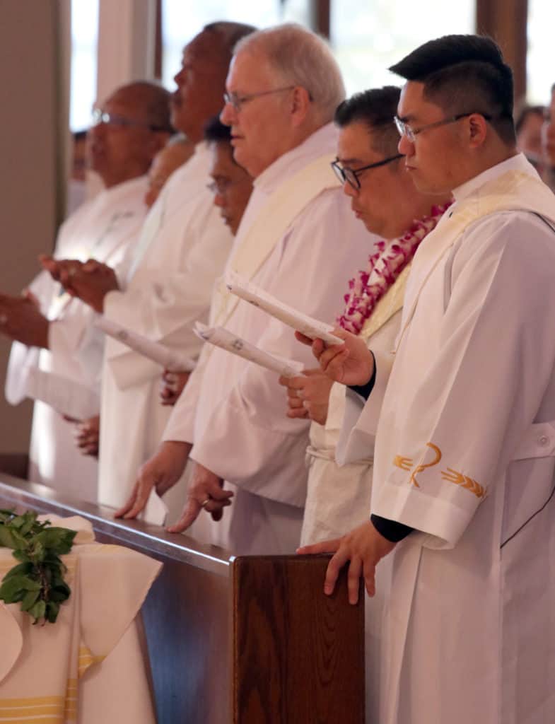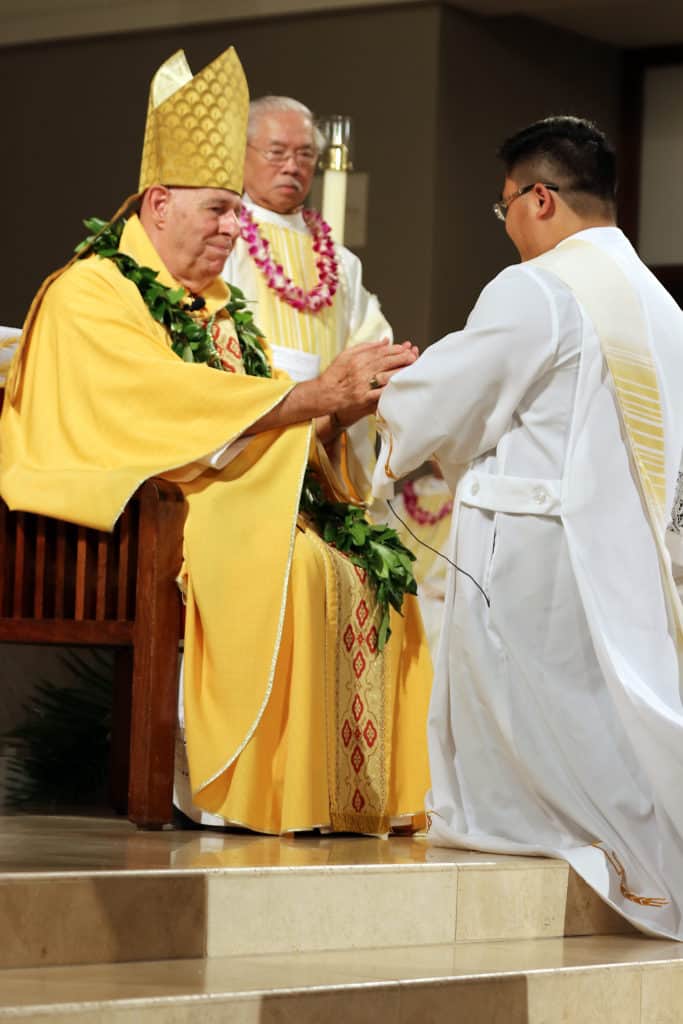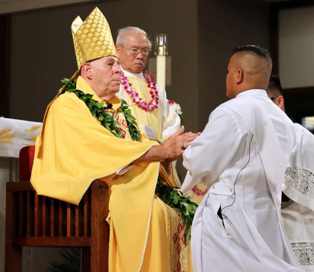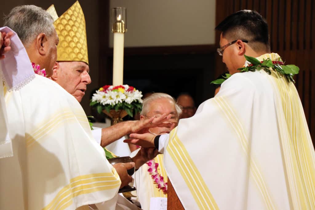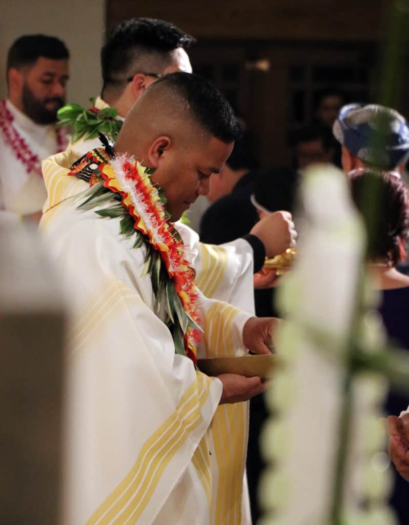 Bishop Silva then anointed their hands with holy Chrism, carried in a calabash carved from the wood of the Islands’ first kiawe tree, planted by Hawaii’s first Catholic missionaries.