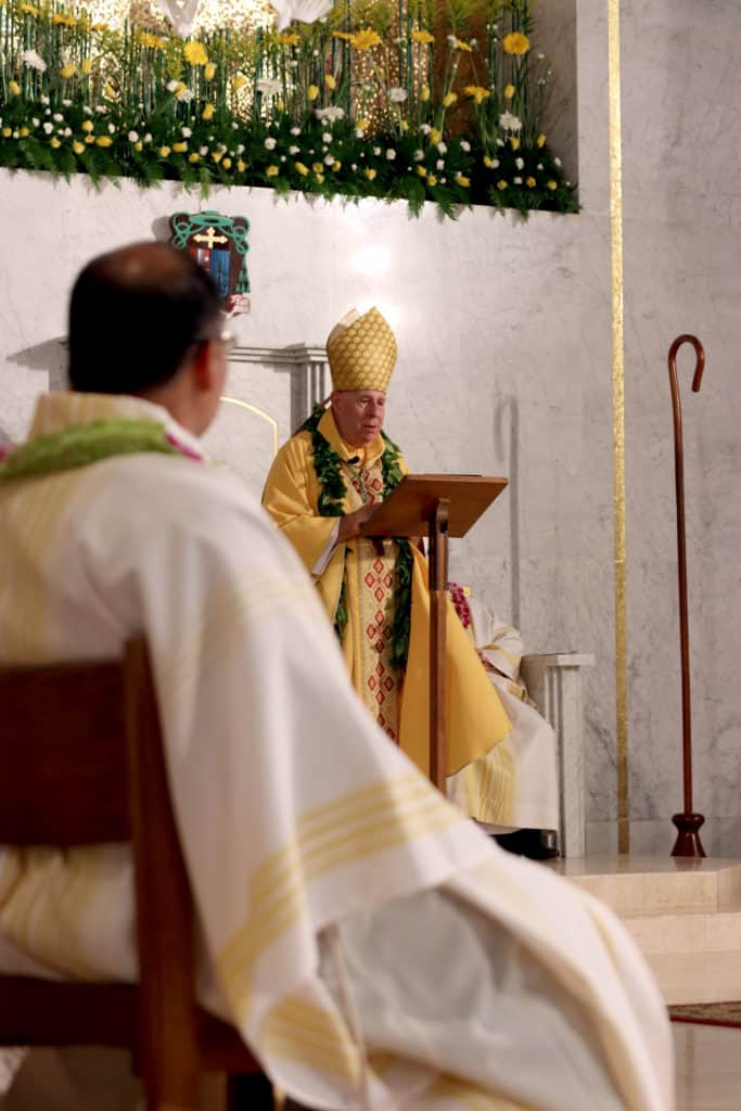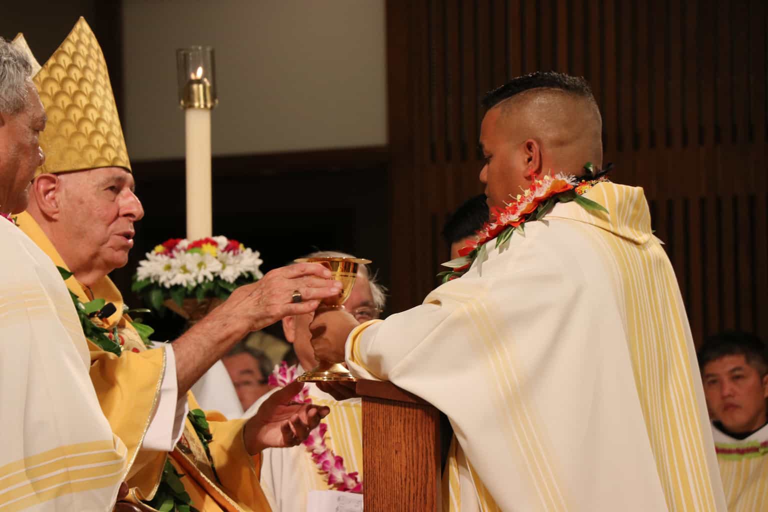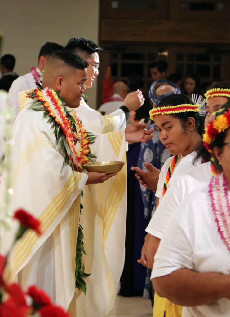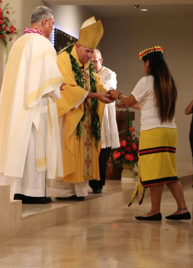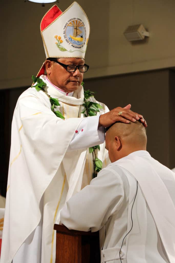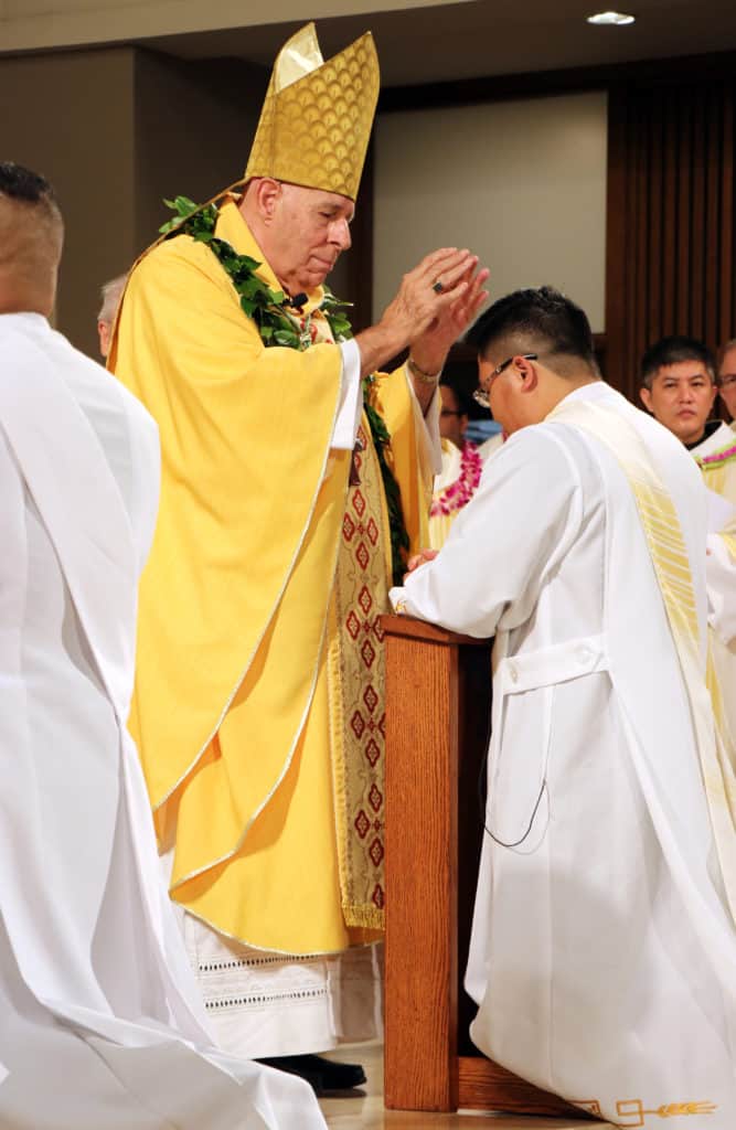 Bishop Silva then anointed their hands with holy Chrism, carried in a calabash carved from the wood of the Islands’ first kiawe tree, planted by Hawaii’s first Catholic missionaries.