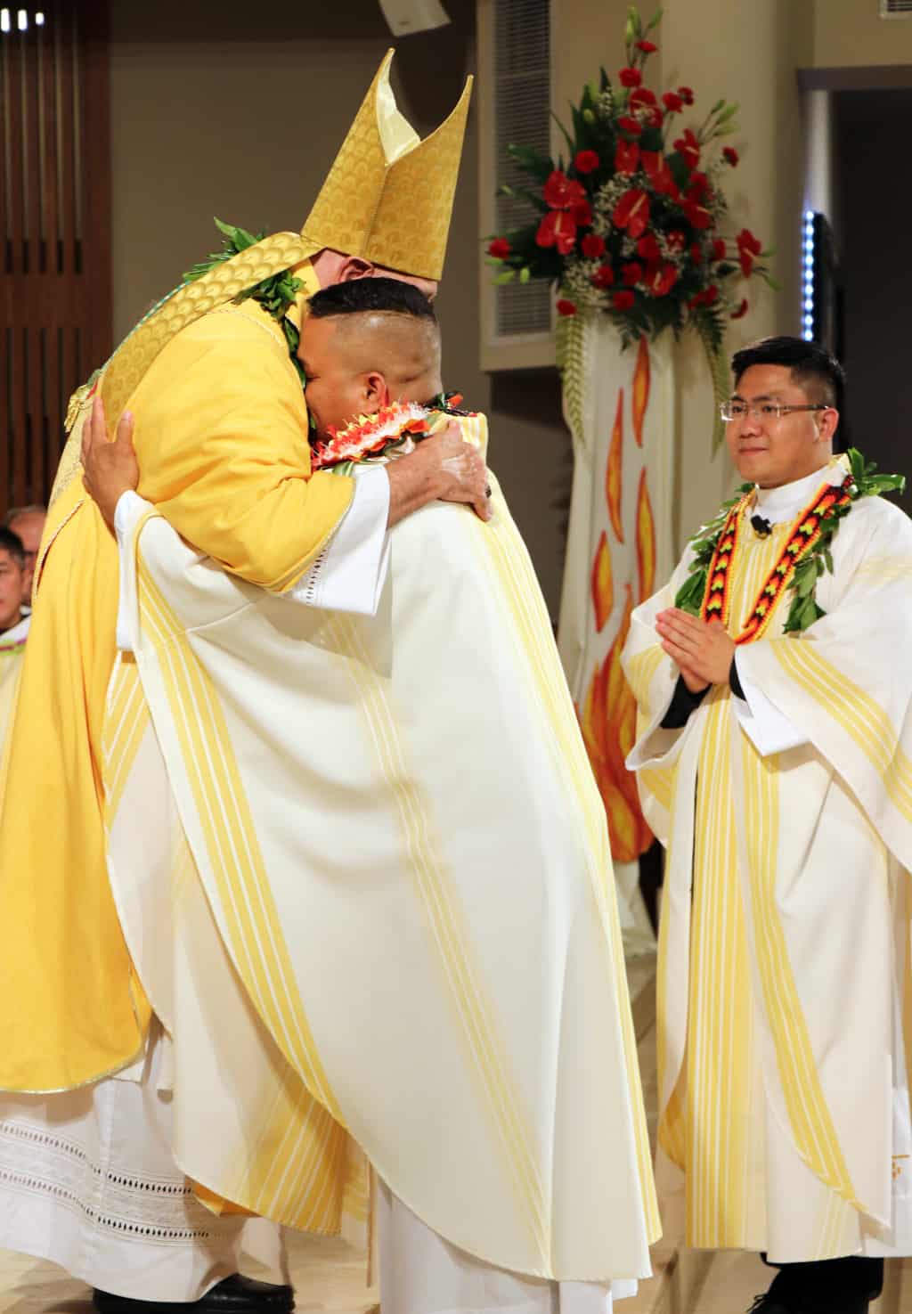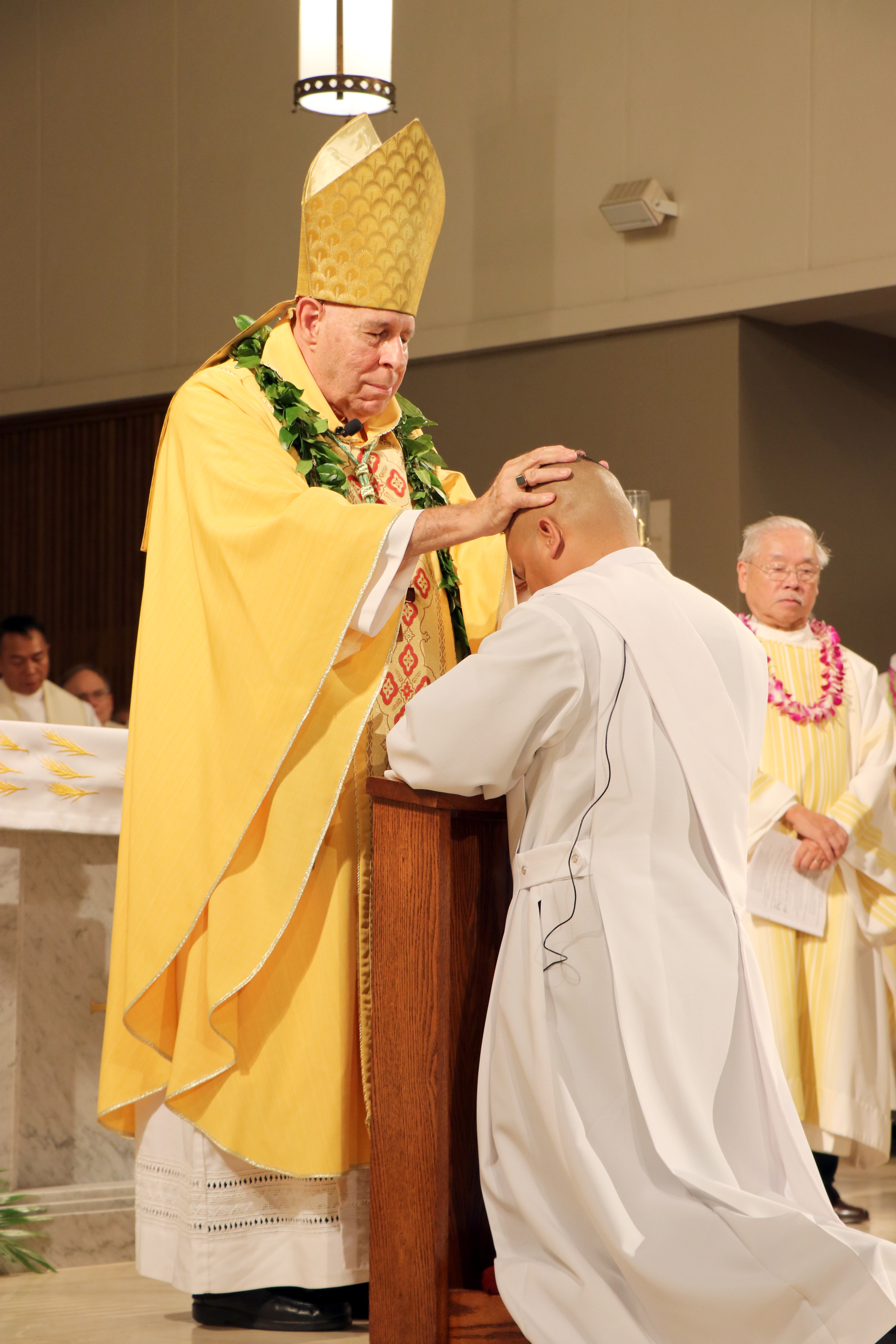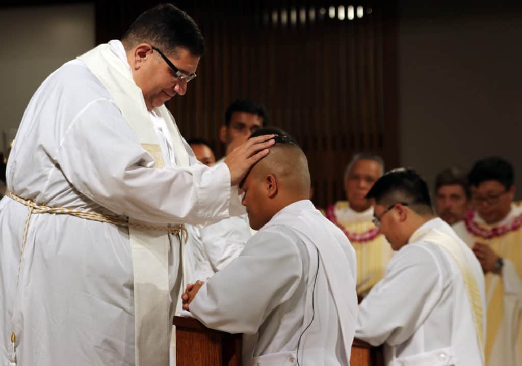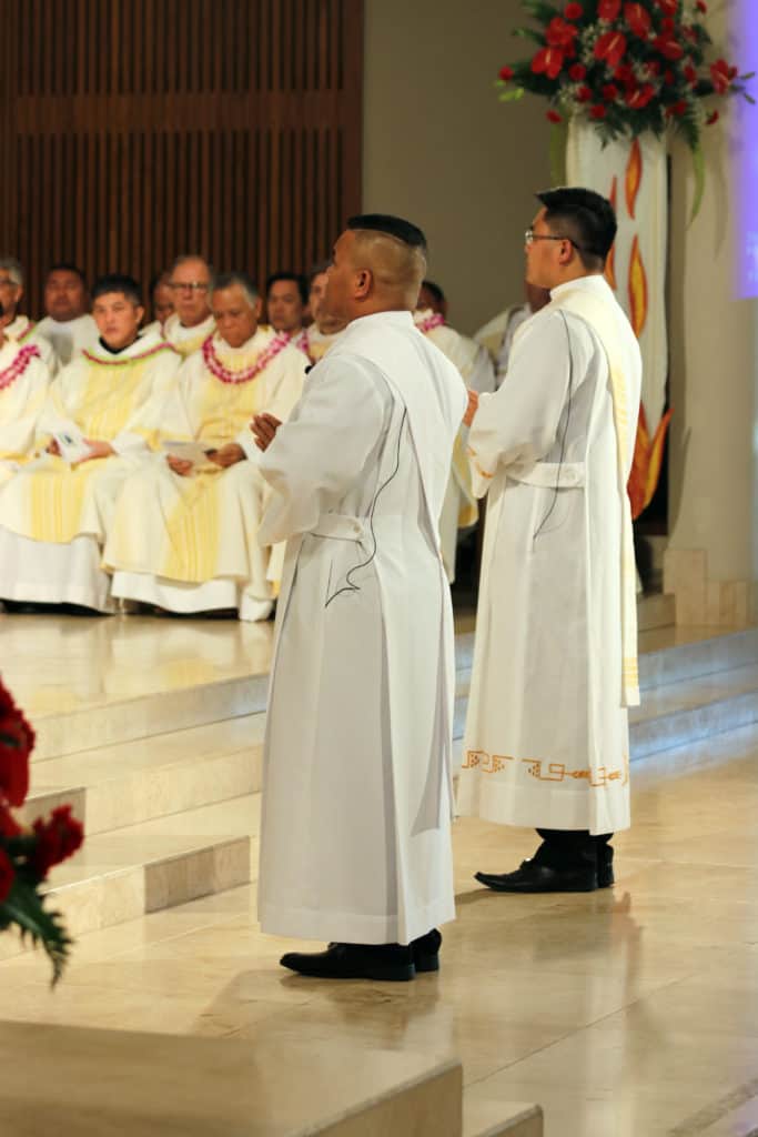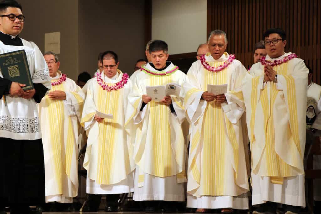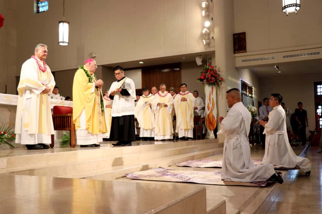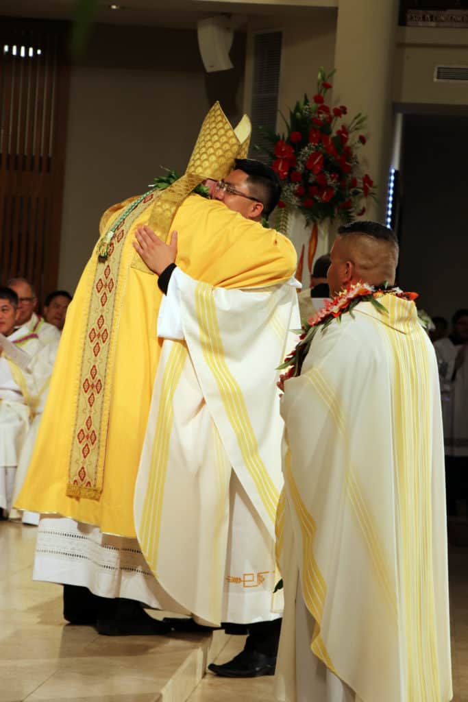 Bishop Silva then anointed their hands with holy Chrism, carried in a calabash carved from the wood of the Islands’ first kiawe tree, planted by Hawaii’s first Catholic missionaries.