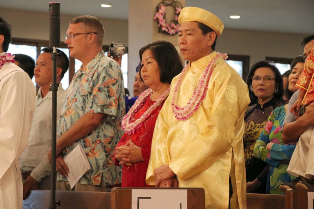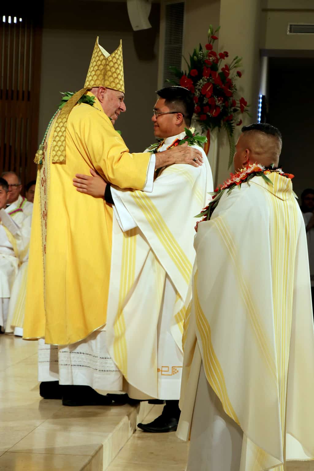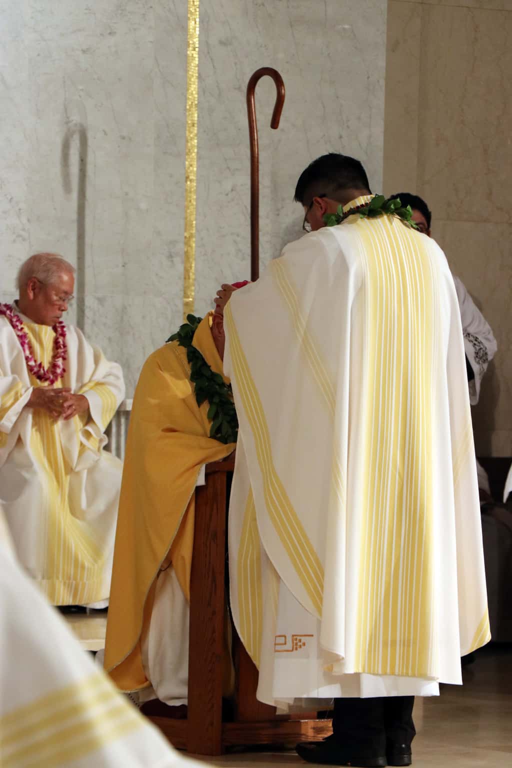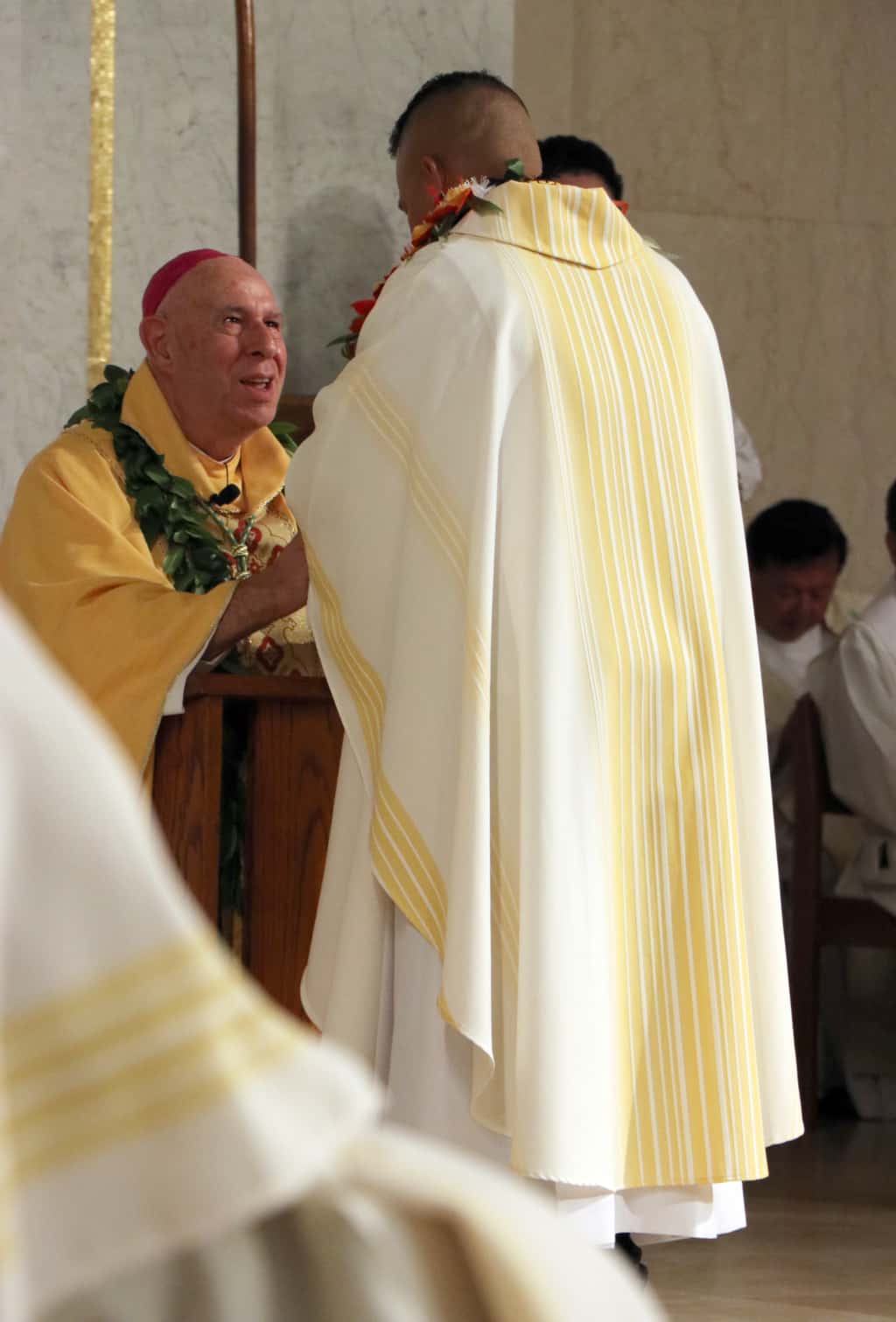 Bishop Silva then anointed their hands with holy Chrism, carried in a calabash carved from the wood of the Islands’ first kiawe tree, planted by Hawaii’s first Catholic missionaries.